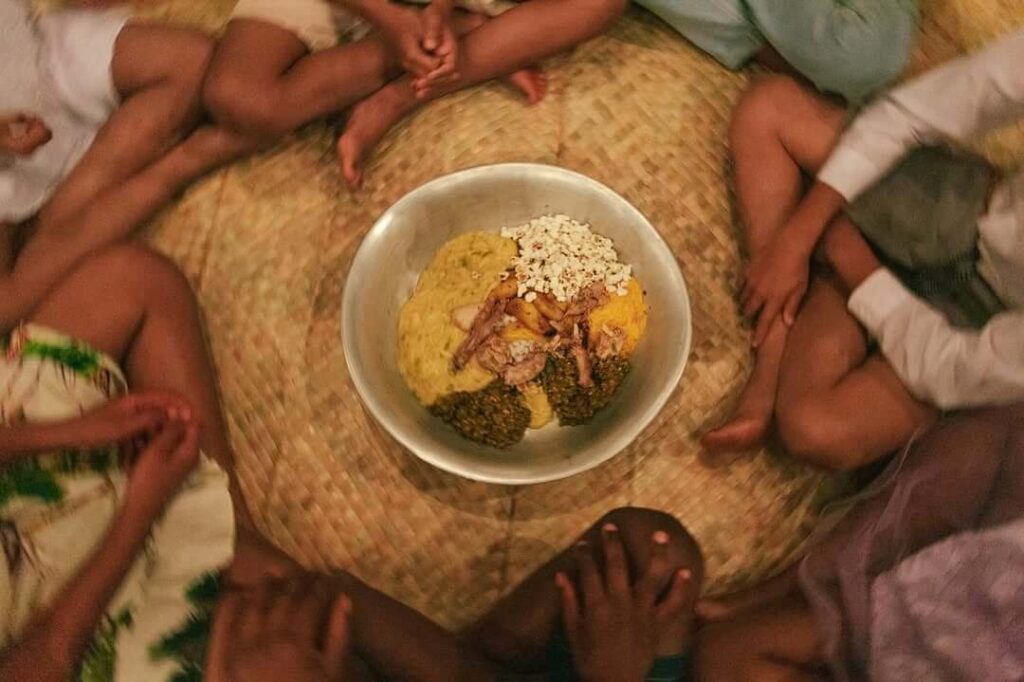 Há 11 anos, Dona Menina prepara o caruru de Cosme e Damião em sua comunidade, na Chapada Diamantina, interior da Bahia. O gesto cumpre a promessa feita aos santos pelo nascimento de seus netos gêmeos, Pedro e Joana.