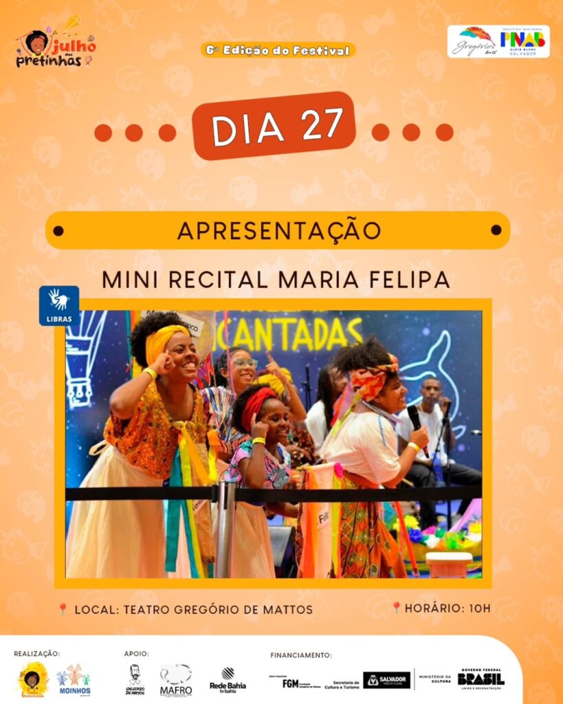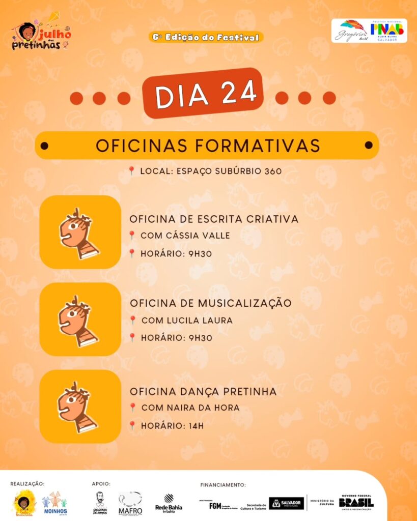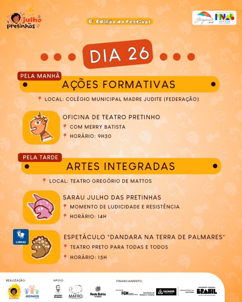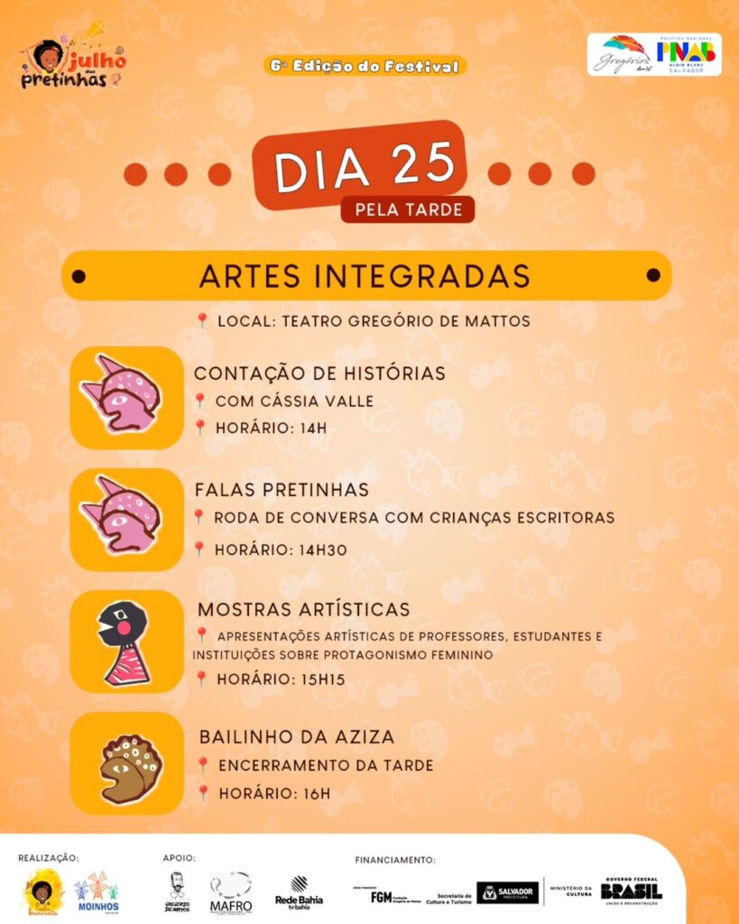 O projeto Julho das Pretinhas – Festival Infanto Juvenil de Artes Integradas para Infâncias Negras com ludicidade e formação antirracista foi contemplado pelo edital Gregórios – Ano IV com recursos financeiros da Fundação Gregório de Mattos, Secretaria Municipal de Cultura e Turismo, Prefeitura de Salvador e da Política Nacional Aldir Blanc de Fomento à Cultura (PNAB), Ministério da Cultura, Governo Federal.