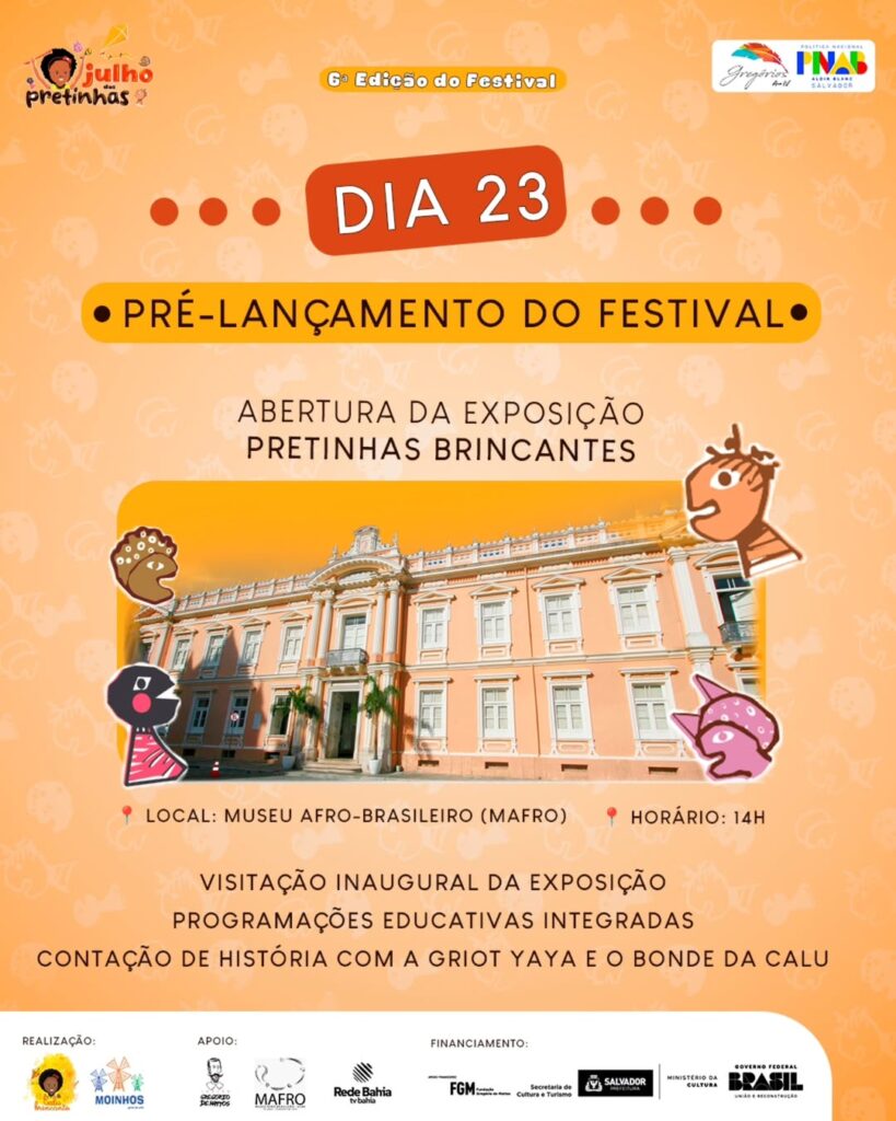 O Festival Julho das Pretinhas chega à sua 6ª edição se consolidando como único festival voltado inteiramente para as infâncias negras em Salvador (BA) e ampliando sua programação em diferentes pontos da cidade. Nesta edição, o evento acontece entre os dias 23 e 27 de julho, reunindo 17 atividades culturais em cinco dias de programação gratuita que acontecem nos espaços: Museu Afro-Brasileiro da UFBA, Espaço 360º, Teatro Gregório de Mattos e Escola Municipal Madre Judite.