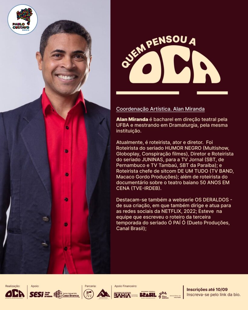 O projeto será realizado no Centro Cultural SESI Casa Branca, em Salvador, e oferece oficinas práticas que percorrem todas as etapas da produção audiovisual – do roteiro à edição. Dividido em duas fases, o programa contempla momentos de formação técnica e artística e também a produção de curtas-metragens autorais, que serão exibidos em mostra pública e disponibilizados online, ampliando a visibilidade do trabalho dos participantes.